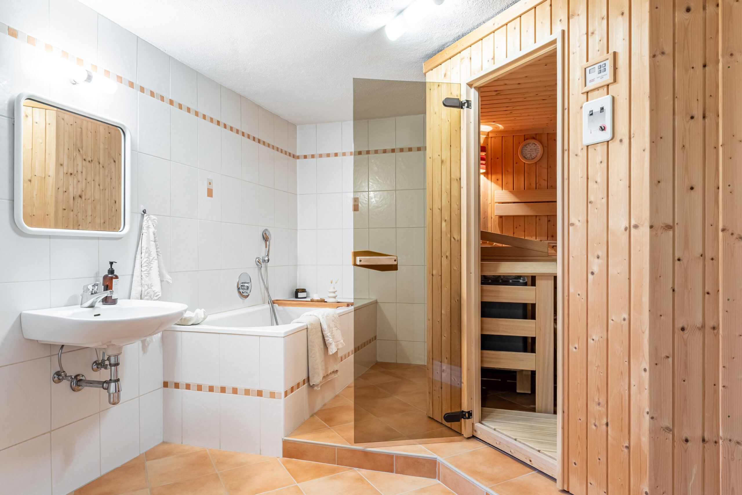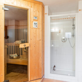 Ein besonderes Highlight dieses Hauses ist der schöne Wellnessbereich. Die stilvolle Sauna lädt zum Entspannen ein und bietet in Kombination mit dem großzügigen Badezimmer höchsten Komfort. Für erholsame Stunden im Freien stehen Ihnen zwei Terrassen zur Verfügung: Je nach Sonnenstand oder Temperatur können Sie auf der vorderen oder hinteren Terrasse Energie tanken und die Ruhe der Natur genießen.